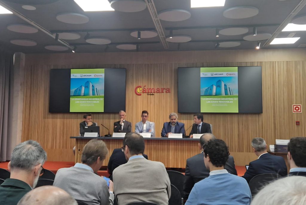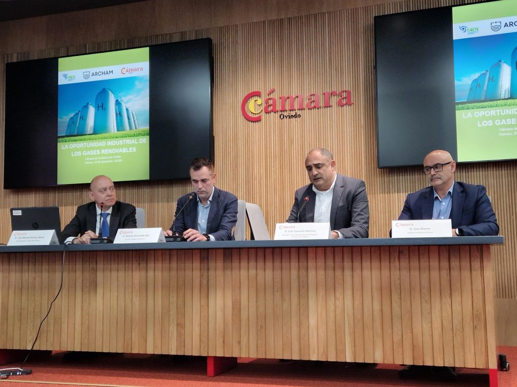 17.- The MINE-TO-H2 Project was presented by Yago Somoano, Head of the Innovation Department at HUNOSA, at the Conference The industrial opportunity of renewable gases organised by the Oviedo Chamber of Commerce and FAEN. Luis Bausela from DURO FELGUERA and Víctor Barrio from ALSA also participated in various round tables during the conference (Oviedo, Spain, 28 November, 2025).